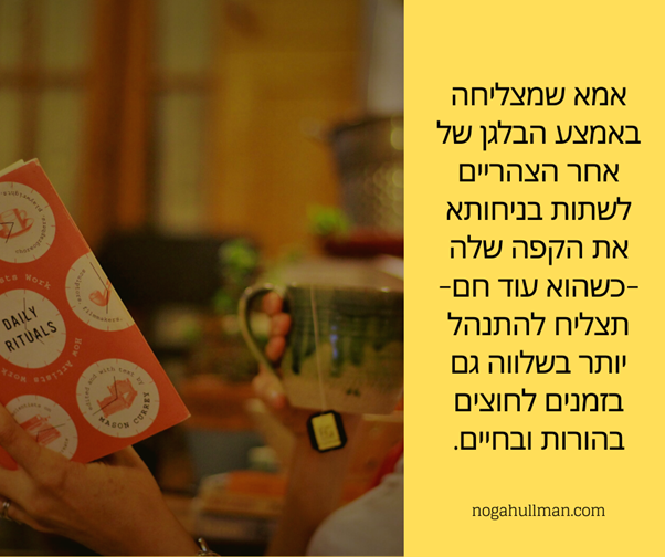 הוא ישיב לך כמה רגעים לעצמך – וגם רוגע. הילדים הקטנים ימשיכו להיות תחת עינייך הפקוחות, אבל את תתני למתרחש בבית להמשיך ולהתרחש בזמן שאת שותה מהכוס האהובה עלייך (לא סתם קראתי לספר שלי "אמא שותה את הקפה חם" -:).